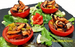 Disponete i pomodori in un vassoio e farcitele con le cozze e il peperone. Decorate il piatto con l’insalata e servite subito.