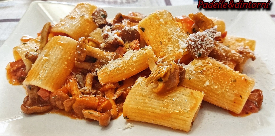 Cuocete i paccheri in una pentola con acqua leggermente salata all’ ebollizione per il tempo indicato sulla confezione e versatela grondante nel condimento. Saltate e solo all’utimo aggiungete i finferli.