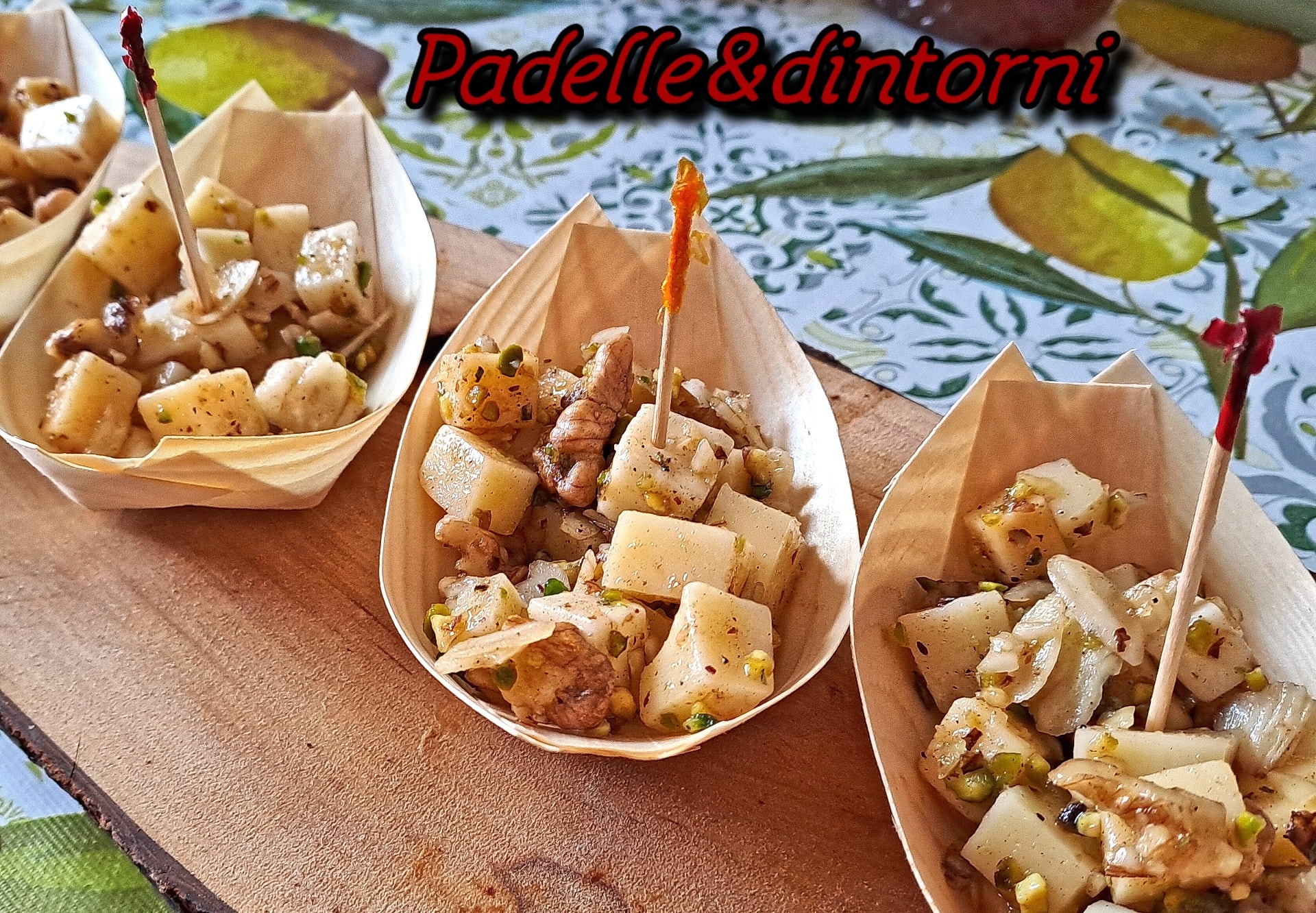 Fate tipo una vinagrette ben battuta con la frusta con olio evo, grappa, cannella, sale e pepe.