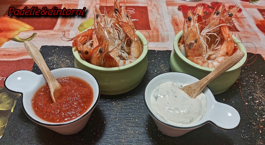 Delle mazzancolle in stile tapas adatte per un apericena o come antipasto in una cena “degustazione” a tema. Sono servite con due salsine : una al peperoncino e una classica alla maionese aromatizzata alla scorza di limone e basilico.