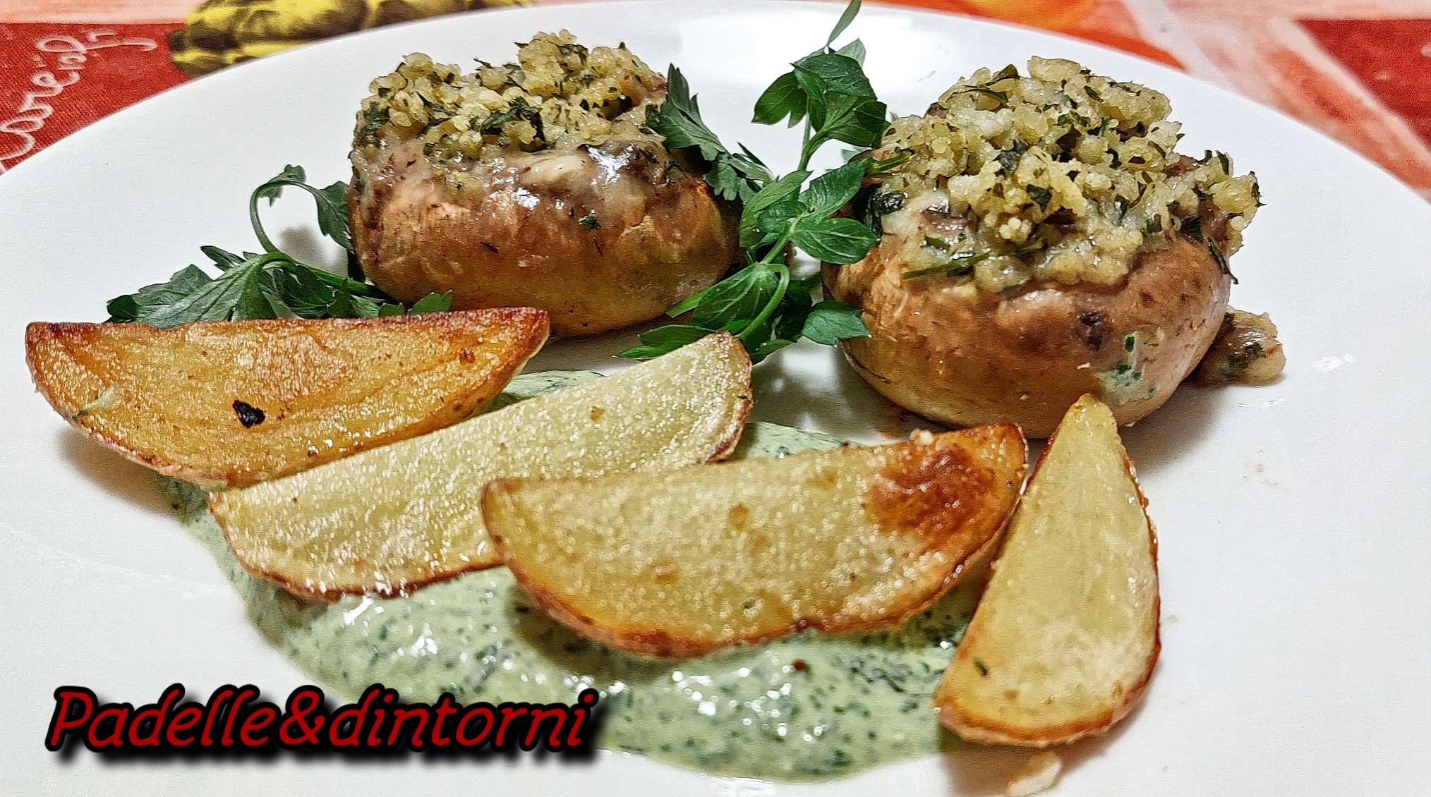 Impiattate creando una cucchiaiata allungata di salsa di basilico. Posizionateci sopra degli spicchietti di patata e accanto le cappelle di fungo. Guarnite con dei rametti i di prezzemolo e servite.