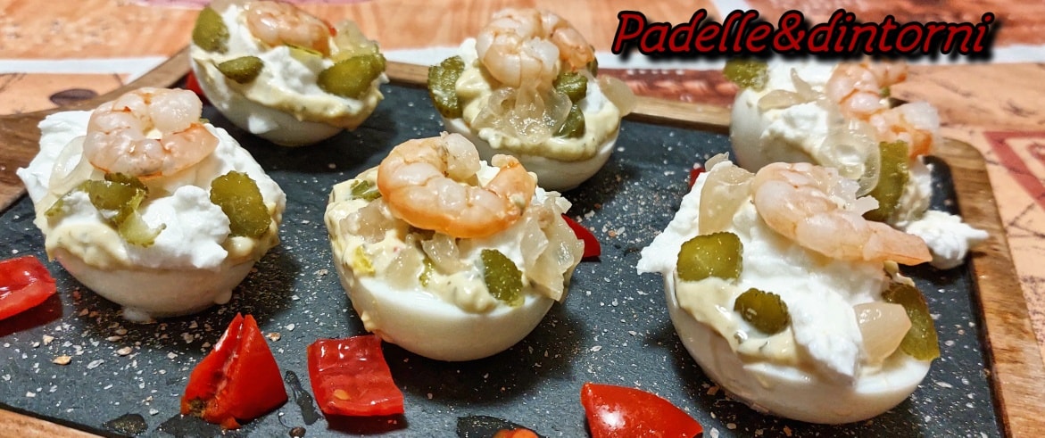 Questa volta vi voglio proporre un uovo sodo non ripieno ma con un ulterioriore farcitura a base di salsa tartara con finocchietto , stracciatella e code di mazzancolle al vapore.