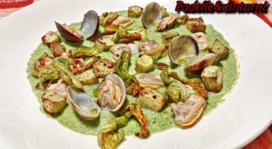 Per dire che non sapevano di niente e che non davano sazietà. Naturalmente si parla degli anni 70, anni in cui si andava al ristorante o meglio alla trattoria solo ed esclusivamente per abbuffarsi. Sempre se il portafoglio quell’anno te lo permetteva. Invece ora la zucchina ha un suo perchè. Si lega molto bene a tante preparazioni, può diventare una crema , una vellutata, ci si può giocare con le consistenze abbinandola ad alimenti più sapidi per bilanciarli. Questa preparazione semplicissima ne è la prova. Può essere servita come un antipasto diciamo anche importante visto il costo delle vongole veraci o come secondo in una cena a tema magari con più assaggi.